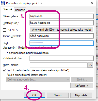 3. Vyplníte název relace a přístupové údaje, které najdete v aktivačním e-mailu, jenž přišel po aktivaci hostingu. Nebo si je vytvoříte v administraci hostingu (v záložce FTP).