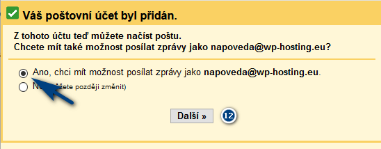 - Váš poštovní účet byl přidán.Nyní máme možnost nastavit možnost posílání zpráv. Nechte vybranou volbu  Ano, chci mít možnost posílat zprávy jako „Váš e-mail“  a pokračujte na Další >>