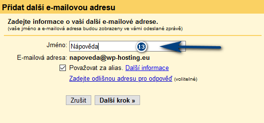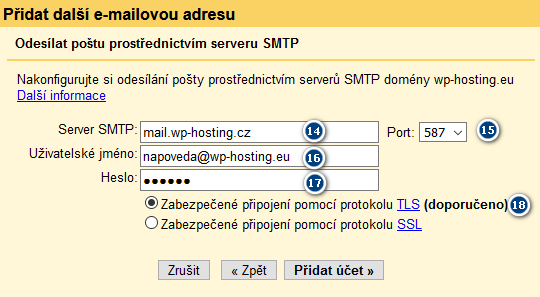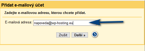 - Nyní je třeba zadat uživatelské jméno: zadejte celou e-mailovou adresu (ve vzoru napoveda@wp-hosting.eu, vy budete zadávat Vaši adresu)