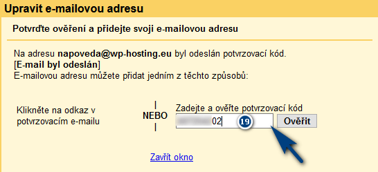 - Vložíte kód z e-mailu a dejte Ověřit.