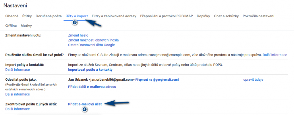 - Zkontrolovat poštu z jiných účtů: kliknete na Přidat e-mailový účet