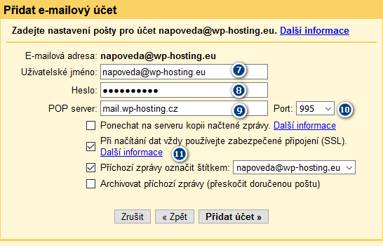 - Zaškrtněte volbu Při načítání dat vždy používejte zabezpečené připojení (SSL).  Pokračujte na Přidat účet >>