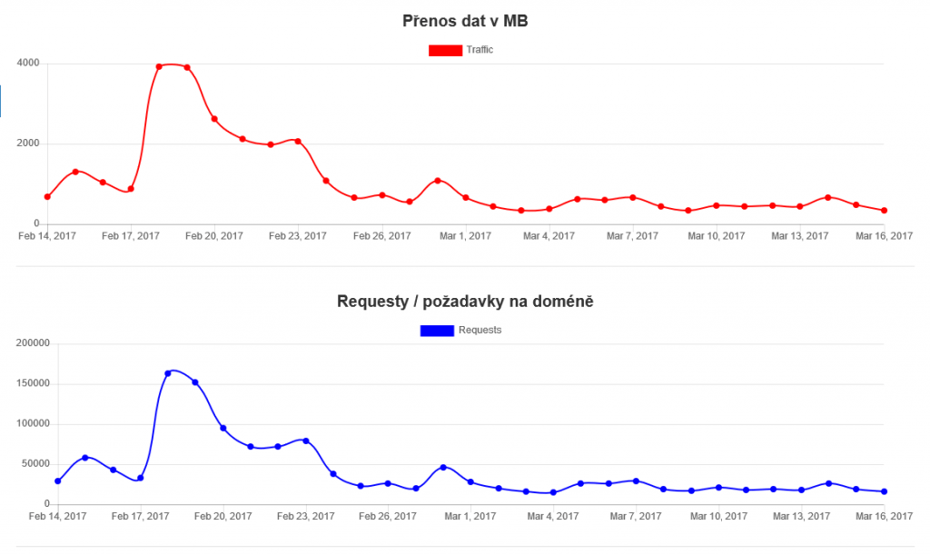 Do zákaznické administrace jsme přidali i vizualizaci pro přenesená data (traffic) a počet requestů za posledních 30 dní. Útoky na web mají svůj charakteristický způsobem a projevují se větším počtem zasílaných požadavků na web (requestů) a tím pádem i větším přenosem dat. Budete-li pátrat, zda se s webem něco nestalo, na první pohled Vám graf může prozradit, že se dělo něco, co rozhodně vyžaduje Vaší pozornost.